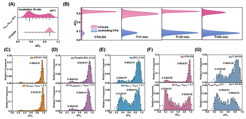 在核酸-蛋白质相互作用研究方面,研究团队采用固态纳米通道单分子平台,首次实现了对DNA/RNA ?G4被特定蛋白质(TEP1、RTEL1、nsp13)实时解旋过程的直接监测(图1)。该研究成功观测到20 nM人体端粒序列DNA(hTel)在弱酸性条件(pH 5),0.5 M CsCl缓冲介质中,可被10 nM TEP1或RTEL1蛋白在1小时内高效解旋为单链DNA(ssDNA)。TEP1蛋白展现出对混合型拓扑结构G4的选择性解旋能力,而对平行型G4作用甚微(见图2)。在SARS-CoV-2病毒RNA 研究方面,实验证实来源于病毒基因组的RNA G4结构(如RNA-1574)可在2 M LiCl、pH 5条件下,被其解旋酶nsp13高效解链, 50%摩尔比的nsp13在1小时内即可实现RNA-G4显著解折叠。该技术为理解G4结构在端粒维持、肿瘤发生及病毒复制等关键生物学过程中的作用机制提供了全新的单分子研究工具。